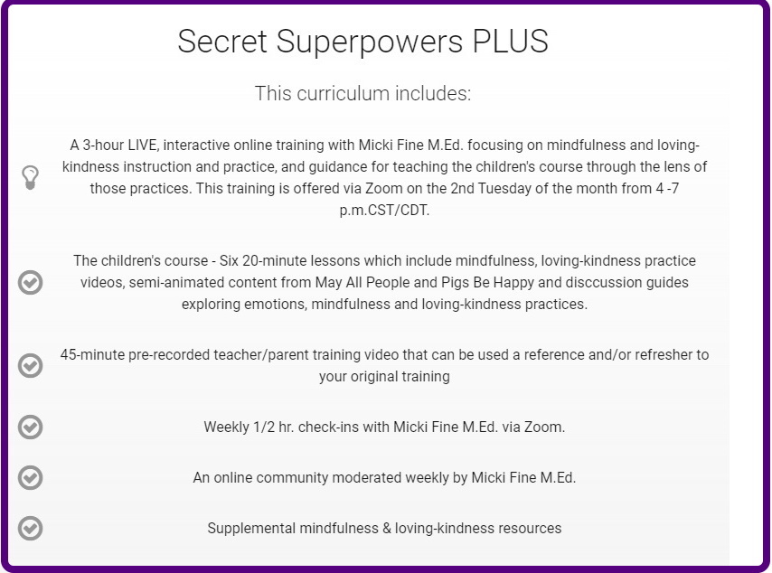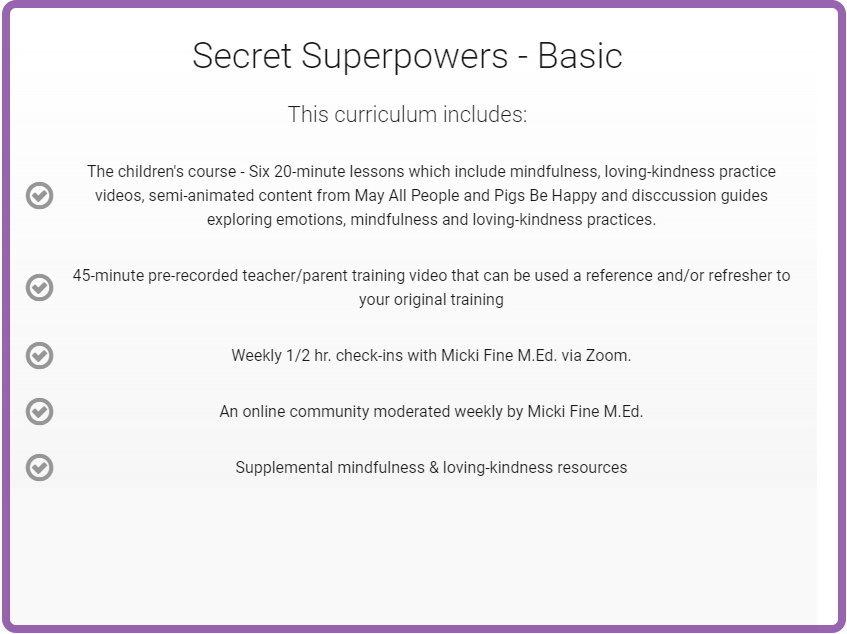 The Secret Superpowers BASIC version of the curriculum provides a 45-minute, pre-recorded teacher training. This shorter version is offered for those who cannot attend or pay for the live, online training. BASIC training includes teacher training but without live interaction and in-depth conversation. This training can also be reference and refresher after the live training.